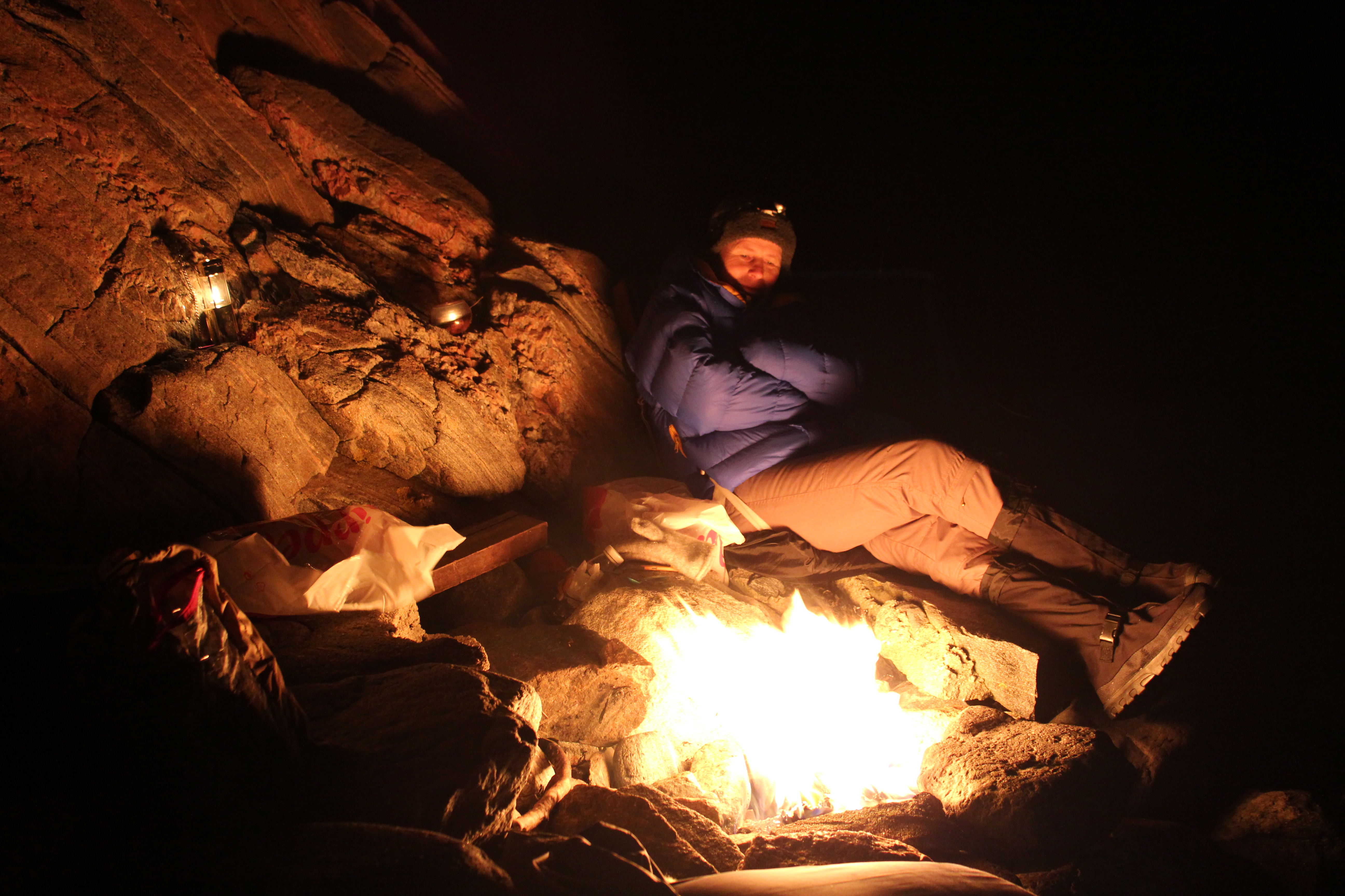 Vi fant ly for vinden og kledde oss i dun og ull. Termometeret viste fire blå grader. Akkurat passelig. Så nøt vi en treretters middag tilberedt på bål, løste noen verdensproblemer, og krøp i soveposene. Bakteppet var den store stjernehimmelen og de duvende bølgene. Nydelig å sovne til. Vi konstaterte at dette var kvalitetstid. Verdt å prøve:)