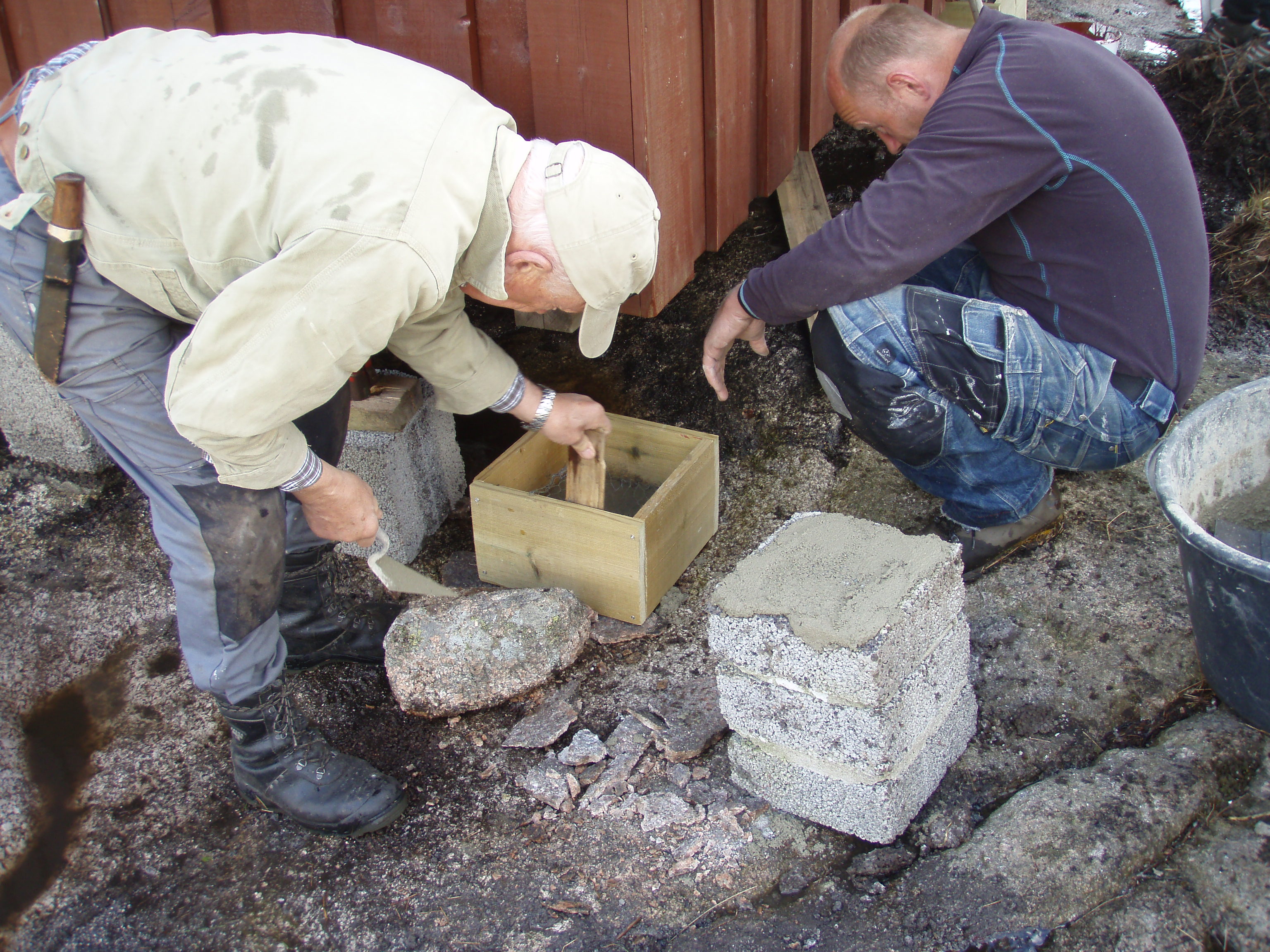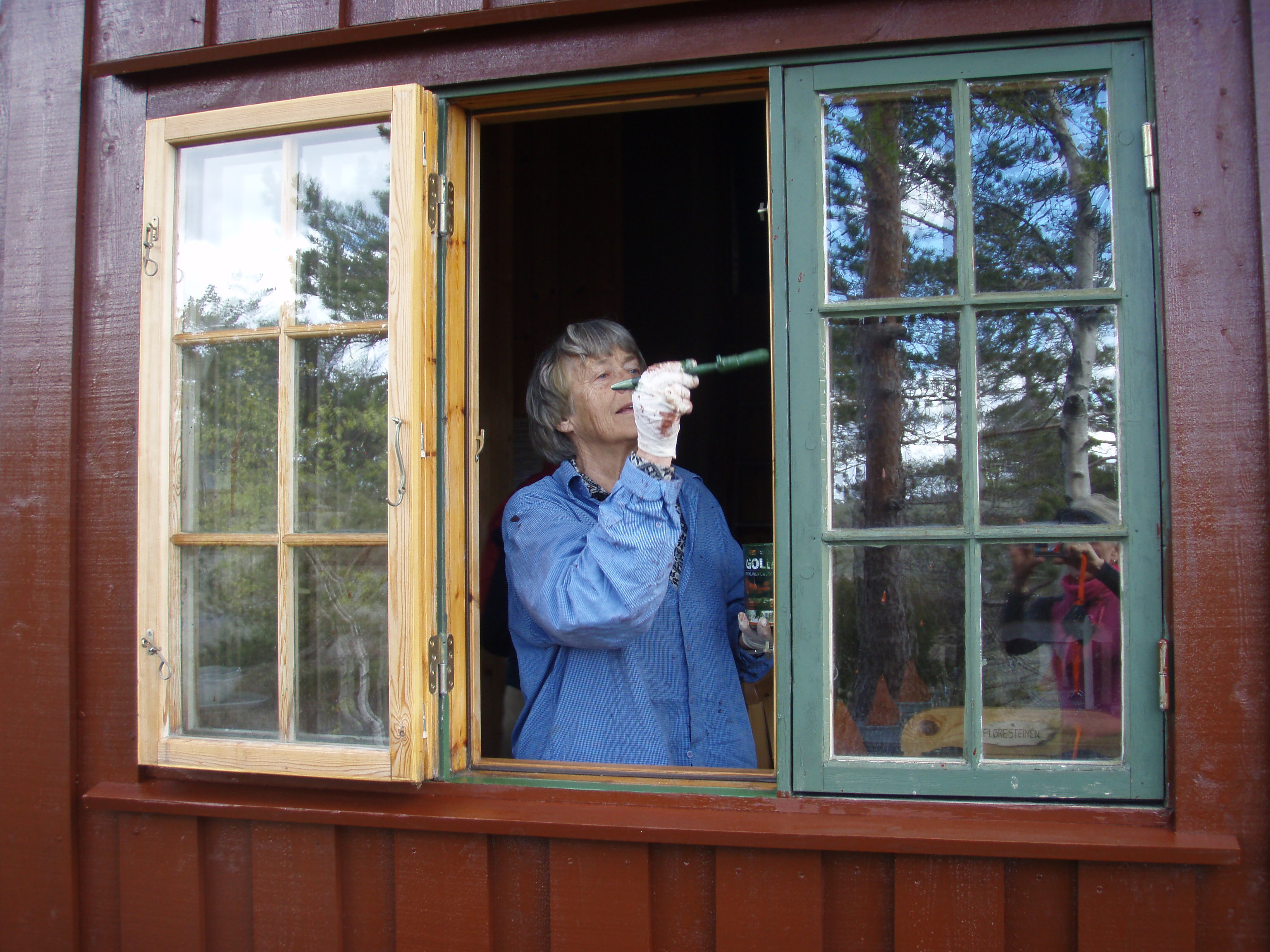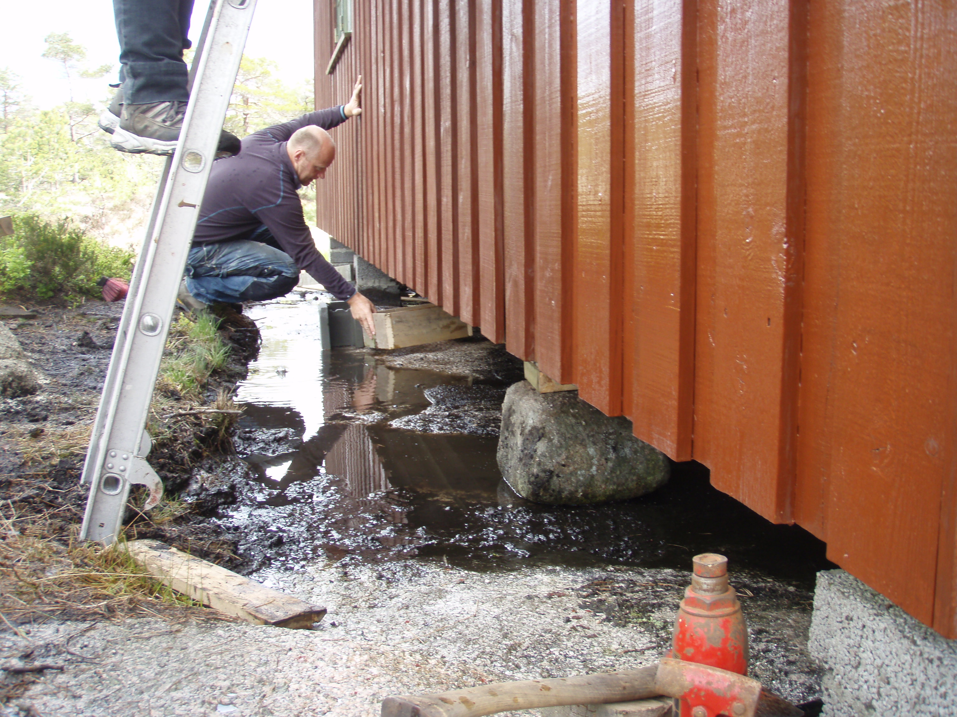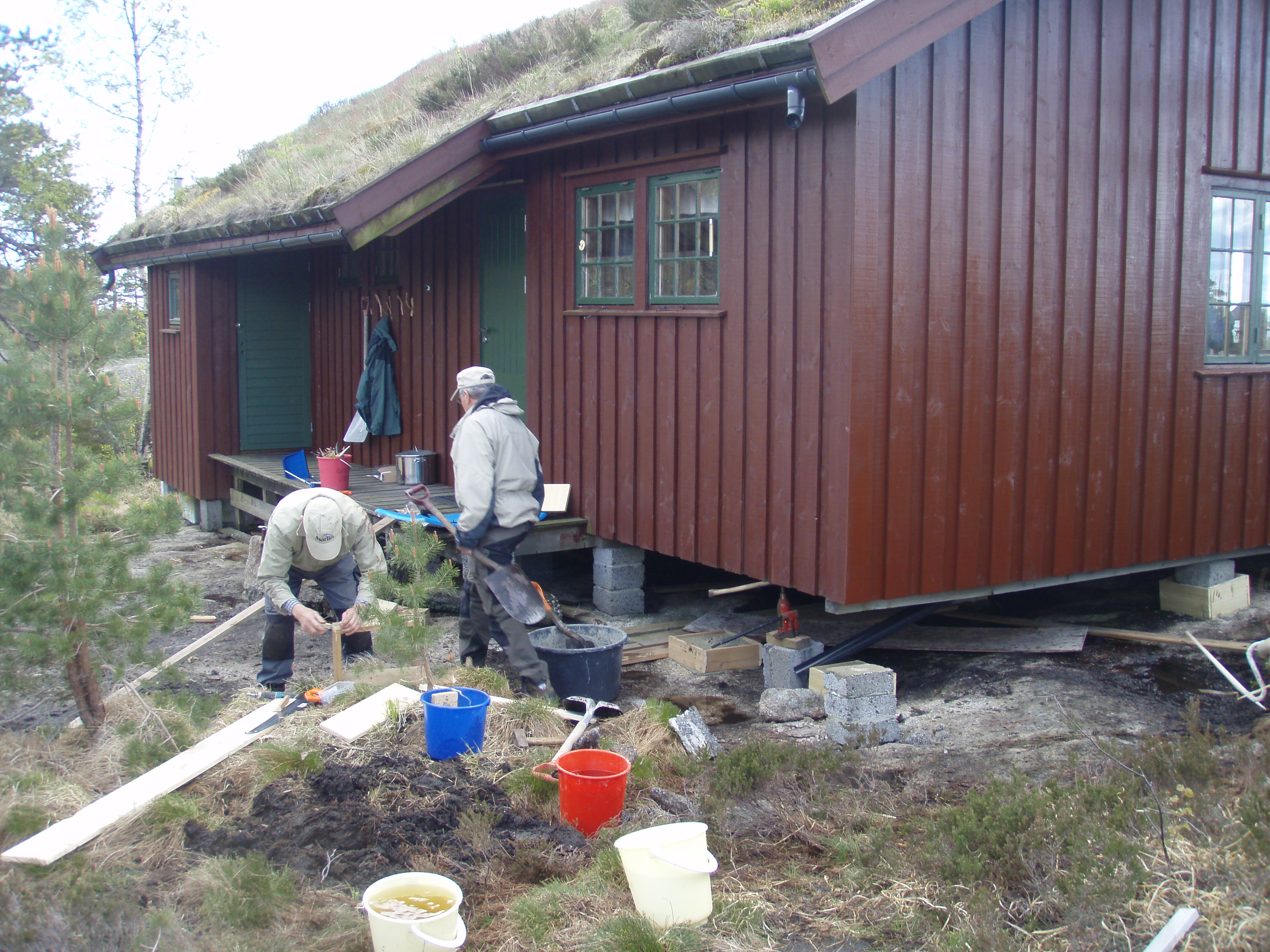 Vi fikk gjort masse. Hytta har fått nye pilarer under, og beis på vegger og vinduer.