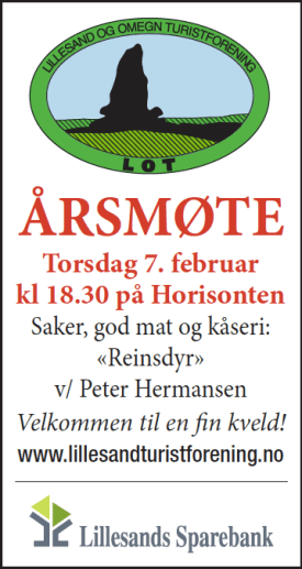 Årsmøte 2019, torsdag 7. februar Postet den 29. januar, 2019 av Lillesand Turistforening Legg igjen en kommentar Årsmøte 2019 Velkommen til årsmøte. Torsdag 7. februar 2019, på Horisonten, kl. 18.30 Årsmøtesaker, bilder fra tur og natur, og god mat. Årets kåseri: Reinsdyr, ved Peter Hermansen Velkommen:) Del dette: Klikk for å dele på X(åpnes i en ny fane) X Klikk for å dele på Facebook(åpnes i en ny fane) Facebook Lik Laster inn... Relatert